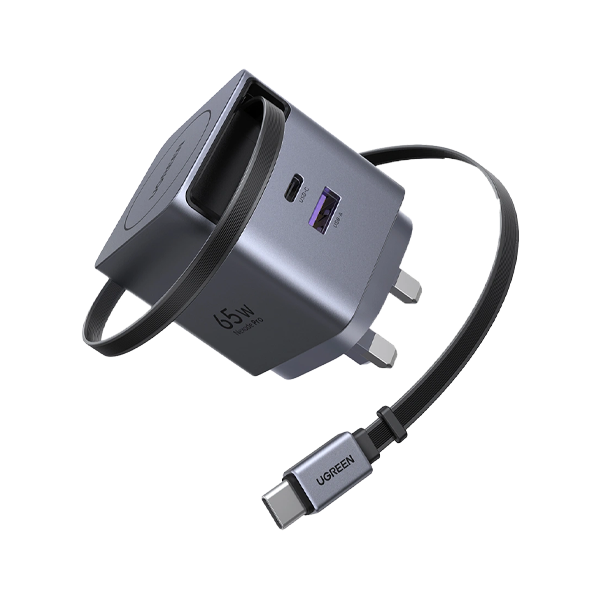 شارژر دیواری با کابل جمع شونده(retractable) 65 وات با یک پورت USB-C و یک پورت USB-A یوگرین مدل X615 کد 65826