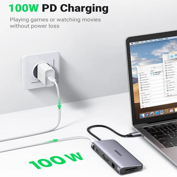 پورت USB-C PD هاب USB-C یوگرین مدل CM179، امکان شارژ سریع لپتاپ و سایر دستگاههای دارای پورت USB-C را فراهم میکند.