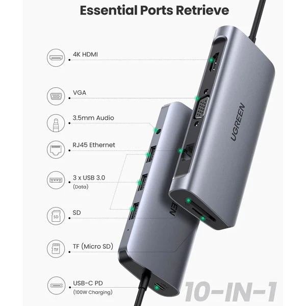هاب USB-C یوگرین مدل CM179 با ارائه 9 و 10 پورت مجزا (با توجه به مدل)، مشکل کمبود پورت را به طور کامل حل میکند و به شما امکان میدهد تا به طور همزمان چندین دستگاه را به لپتاپ یا گوشی هوشمند خود متصل کنید.