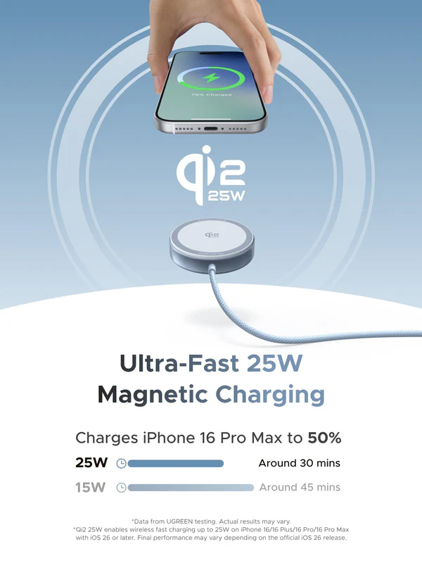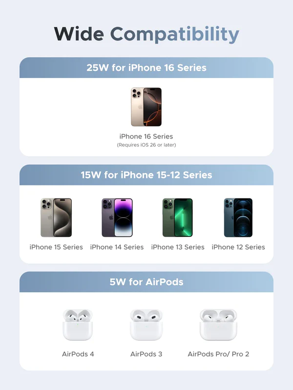 - سازگار با با سریهای آیفون 12 تا 16، ایرپادز 4/3، ایرپادز پرو 2/پرو و سایر دستگاههای مجهز به Qi2