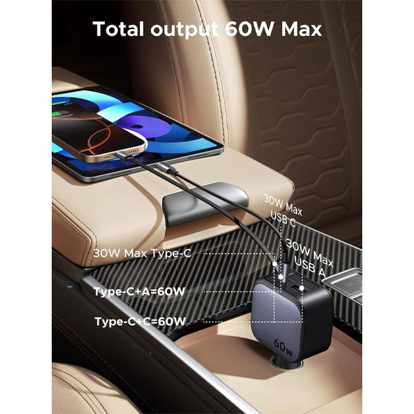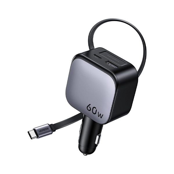 شارژر فندکی با کابل جمع شونده(retractable) 60 وات یوگرین با 3 پورت USB-C و USB-A مدل EC602 کد 55212Bمدل: 55212B
