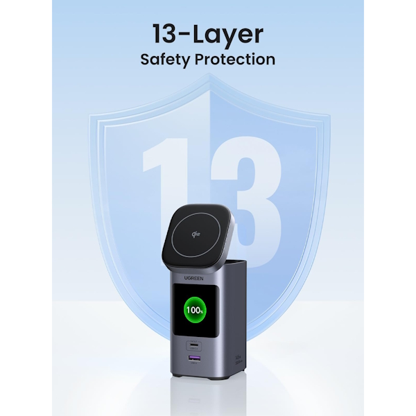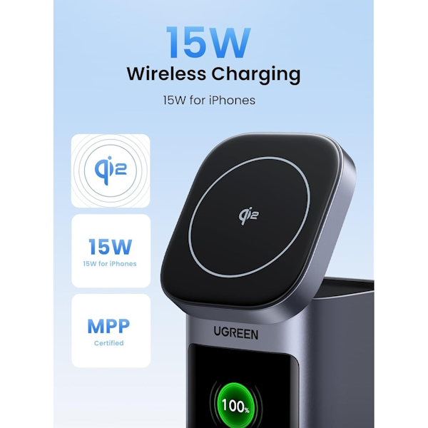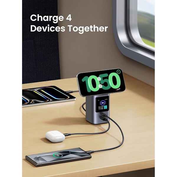 سایر مشخصات | استاندارد Qi2.2, امکان شارژ 4 دستگاه به صورت همزمان, پایه ضدلغزش, چندین لایه محافظ داخلی, دارای کابل USB-C به USB-C, زمان شارژ شدن باتری 2 ساعت, سازگار با Magsafe, شارژ بی سیم با توان 15 وات, طراحی جمعوجور, قابل حمل, قابلیت تنظیم زاویه شارژر مغناطیسی, نمایش لحظهای توان، وضعیت شارژ و زمان, نمایشگر TFT |