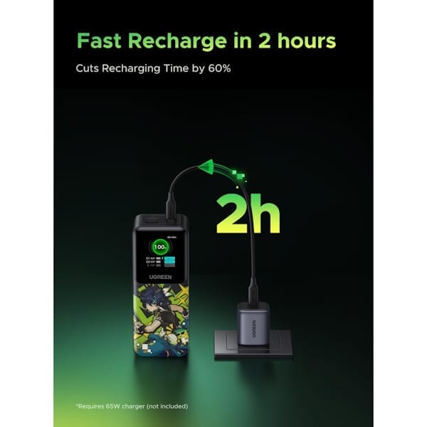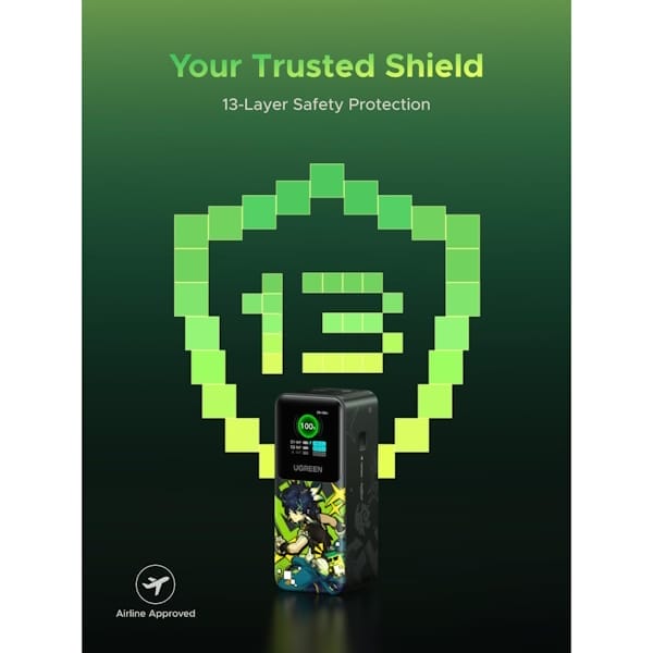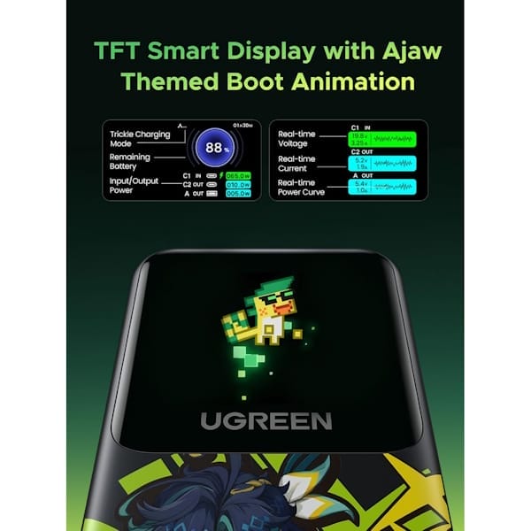 سایر مشخصات | امکان شارژ سه دستگاه بهصورت همزمان, پایه ضدلغزش, پشتیبانی از پروتکلهای PD3.0 ،PD2.0 ،QC3.0 ،BC1.2, چندین لایه محافظ داخلی, دارای کابل USB-C به USB-C, زمان شارژ شدن باتری 2 ساعت, طراحی الهام گرفته از بازی گنشین ایمپکت, طراحی جمعوجور, قابل حمل, نمایش لحظهای توان، وضعیت شارژ و زمان, نمایشگر TFT |